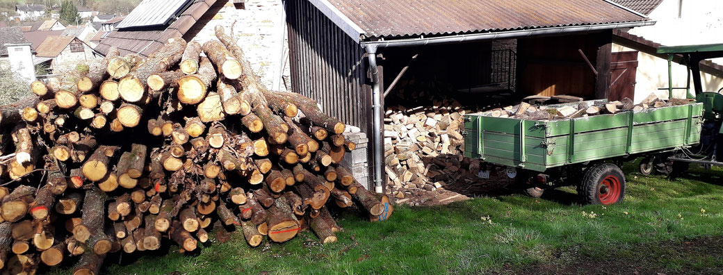 Zum zweiten Mal in dieser Woche habe ich Sonnenenergie in anderer Form aus dem Lager beim Schwiegervater geholt: Vor zwei Jahren eingeschlagenes Eichen- und Buchenholz für unseren wassergeführten Kamin, der über einen Mischer die Fußbodenheizung erwärmt und für warmes Brauchwasser sorgt. Auch im Winter 2018/19 wollen wir es warm im Haus haben und Flüssiggas sparen. Links im Bild liegt schon die diesjährige Holzernte. Das sind 21 Raummeter, die sich vier Haushalte teilen. Da gibt’s demnächst Säge- und Spaltarbeit.