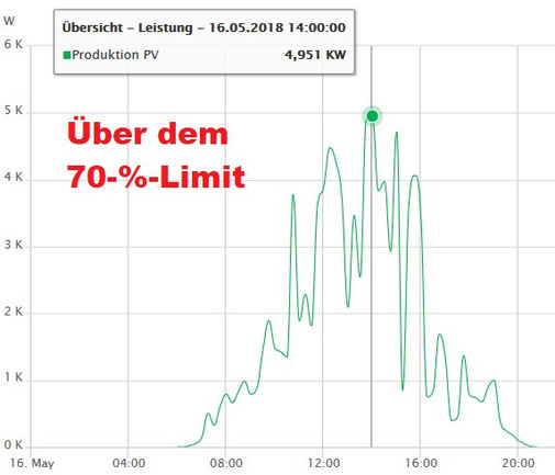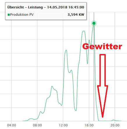 (14.05.2018) Bei diesig-trübem Himmel begann der Tag fürs Steckdosengerät um 8:10 Uhr. Am späten Vormittag regnete es, war danach mal hell-bedeckt mit einzelnen Sonnenstrahlen. So auch zur heutigen Höchstleistung um 16:12 Uhr. Um 17:20 Uhr war Gewittergrollen zu hören; ab 17:45