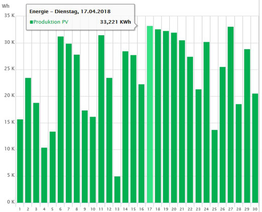 (13.04.2018) Der Freitag war durchgehend dunkeltrüb, am Vormittag schauerte es zeitweise kräftig. Arbeitsbeginn fürs Modul war um 7:44 Uhr; die Höchstleistung um 14:49 Uhr. Am morgigen Samstag sollen sich Sonne und Wolken abwechseln.