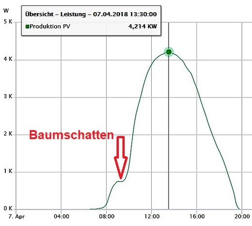 Die Grafik zeigt den makellosen Sonnentag. Die Ostseite des Daches war ein wenig ergiebiger als der Westen. Selbst die kleinen Einbrüche in der Stromproduktion durch die Äste der noch unbelaubten Bäume sind nicht auszumachen.