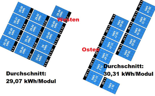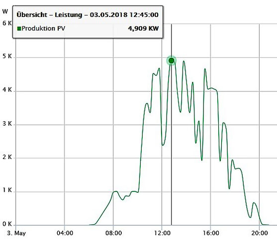 Die 25 Dachmodule produzierten zwischen 7 und 19:45 Uhr Energie mit dem Maximum um 13:15 Uhr. Erzeugt wurden heute 31,3 Kilowattstunden – das ist Rekord seit Inbetriebnahme! Davon gingen 25 kWh ins Netz, aus dem wir 6 kWh (davon 4 kWh in der Nacht) bezogen haben. Meine bessere Hälfte nutzte die Sonne, um zweimal die Waschmaschine laufen zu lassen. Die Ostseite der PV-Anlage war heute klar besser – das schlechteste Ostpanel lieferte mehr Strom als das beste Modul im Westen.