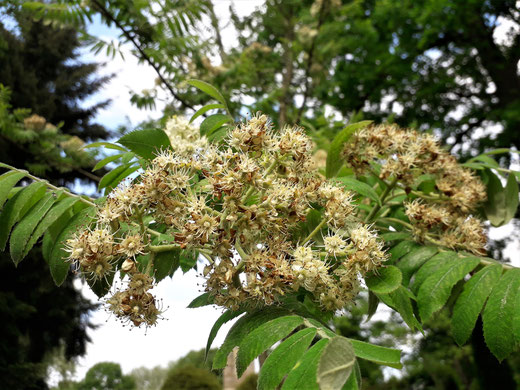 Heute bin ich ein wenig stolz: Vor gut 10 Jahren stifteten wir unserer Gemeinde einen Speierling, eine früher weit verbreitete, aber heute in Deutschland mit nur 2500 Exemplaren sehr seltene Obstbaumart. Der mittlerweile zwar noch dünne, aber schon gut 4 Meter hohe Speierling blüht jetzt erstmals. Die weißen Blüten werden von Bienen umschwärmt. Ob der Baum in diesem Jahr auch schon seine Äpfel trägt, muss abgewartet werden. Für einen Rehborner Apfelsaft ala „Frankfurter Äppelwoi“ wird’s noch nicht reichen.