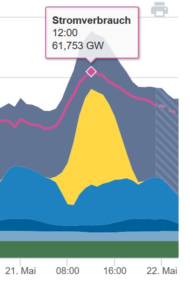 Die Medien waren heute mal wieder auffällig, weil sie über eines nicht berichten: Am Pfingstmontag lieferten die Erneuerbaren Energien 90,68 Prozent des 12-Uhr-Stromverbrauchs – 56 von 61,75 benötigten Gigawatt kamen aus Wind und insbesondere Solarenergie. Die Agora-Homepage zeigt auch, dass dennoch 13,46 GW Kohle- und Atomstrom exportiert wurden. Und dies bei einem Strompreis, der minus 3,98 €/MWh betrug.