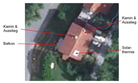 Im Moment spiele ich mit einem Internettool etwas mit Satellitenbildern, um zu sehen, wie auf unser ungünstig ausgerichtetes und vom Berg bzw. Bäumen verschattetes Dach 5 kWp, also etwa 20 Module passen könnten. Das Bild aus dem All muss im Sommer gegen 10:30 Uhr entstanden sein.