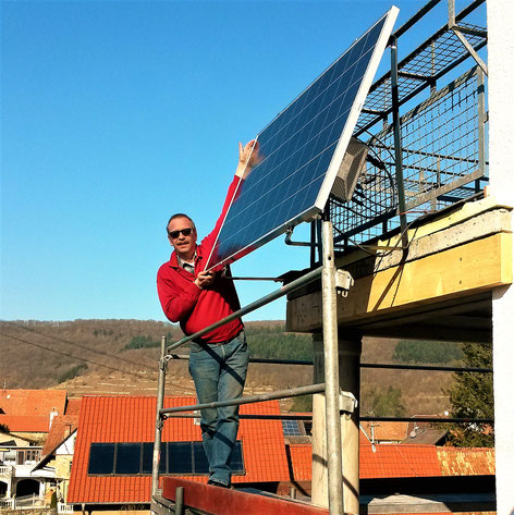 Heute Vormittag kam Thomas Steurer von DZ-4 – der Firma, die Eigenverbrauch-Solaranlagen vermietet (siehe auch Seite Unterstützer) – zur ersten Beratung. Die verschattete östliche Dachseite wurde kritisch beäugt, mehrfach Fotos vom Sonnenstand auf dem Dach gemacht. In den 90 Minuten des Gesprächs haben wir unseren Stromverbrauch jetzt und künftig erörtert, mögliche Montageorte für den Wechselrichter und ggf. einen Stromspeicher besprochen und angesehen. Letztlich kamen wir für 5 KWp auf 20 monokristaline Module mit je 285 Wp von Solaredge, weil diese besser mit Verschattungen und dem schrägen Licht umgehen, die in 3 Teilen aufs Dach montiert werden sollten. 10 Panele horizontal in Zweierreihe firstnah auf der östlichen Dachseite; auf dem westlichen Dachteil 6 Stück über dem Balkon sowie weitere 4 nördlich des Kamins. Meine Vorgabe war, dass ich nicht mehr bezahlen will, als heute der Grundversorger für Ökostrom kassiert: 101 €uro im Monat. Bereits kommende Woche Dienstag will Thomas Steurer mit einem Vorschlag erneut nach Rehborn kommen.