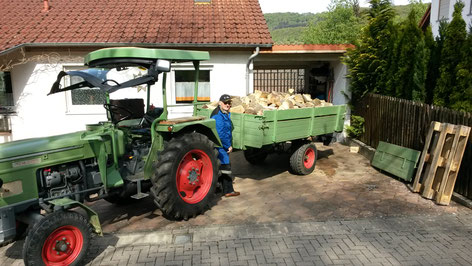 Heute wurde in zwei Fuhren unsere Holzernte des vorvergangenen Jahres vom Schwiegervater aus dem nahen Wald bzw. dem Zwischenlager angeliefert. Runde 6 Raummeter – also etwa 4,2 Festmeter – für Balken und ähnliches nicht geeignetes, dennoch bestes Buchen- und Eichenholz für unseren wassergeführten Heizkamin: Der nächste Winter kommt bestimmt.