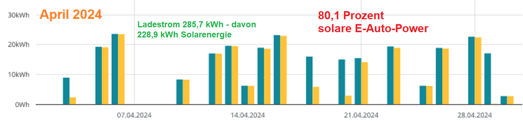 April-Bilanz Teil 2: Da ab April das Laub der Bäume die PV-Paneele auf der östlichen Seite mit wandernden Schatten verziert, sinkt hier die Modulleistung gegenüber den Wintermonaten ab. Dennoch kamen von den 12 285er Modulen der gemieteten DZ-4-PV 250,75 Kilowattstunden, somit 73,32 kWh pro Kilowattpeak. Gegenüber die freie Westseite mit 13 Paneelen mit 277,75 kWh und 74,96 kWh/kWp. Insgesamt verzeichnet das SolarEdge-Monitoring 528,5 kWh Erzeugung, also 74,17 kWh/kWp. Von dieser Stromerzeugung gönnten sich Wechselrichter und Optimierer 17,34 kWh Eigenverbrauch, was den geringeren Gesamtwert gestern für die DZ-4 erklärt.