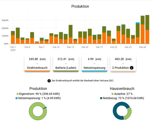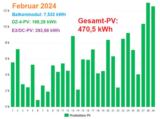 Monatsvergleich: In diesem Februar hat die gemietete DZ-4-PV bisher nur 65,7 Kilowattstunden Strom erzeugt. Im Vorjahresmonat waren es bereits 91,7 kWh – also fast 40 Prozent mehr! Auch im Vergleich Januar und Februar 2024 mit 150,7 kWh gegenüber 158,6 kWh war 2023 ertragreicher.