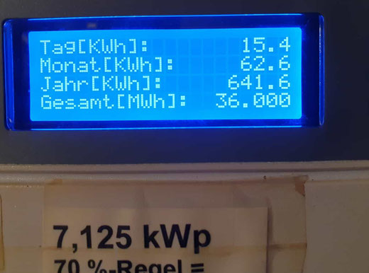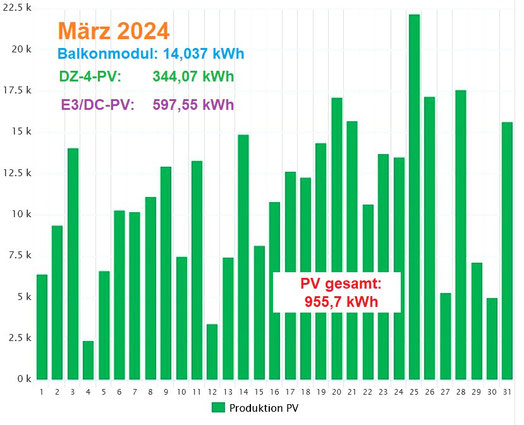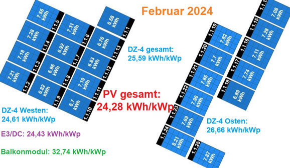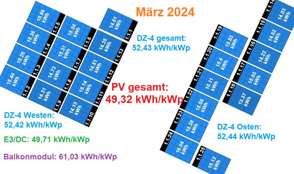 Die E3/DC arbeitete von 7:00 bis 20:45 (DZ-4: 6:30 – 20:30) Uhr mit der Höchstleistung um 14:15 (14:00) Uhr von 12.783 (4678) Watt. Erzeugt wurden 71,89 (Anteil: 28,57) Kilowattstunden, von denen 19,66 kWh die um 1:45 Uhr geleerten Akkus wieder füllten. Verkauft wurden 16 kWh, zugekauft 24 kWh: Jetzt 159 für diesen Monat. Das beste Ostpaneel schickte 1,35 zu 1,15 kWh vom westbesten PV-Modul.