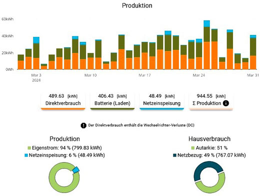 Autarkie 94 % - Eigenstrom 88 % - Netzbezug (ab/bis 0 Uhr): 2,25 kWh.