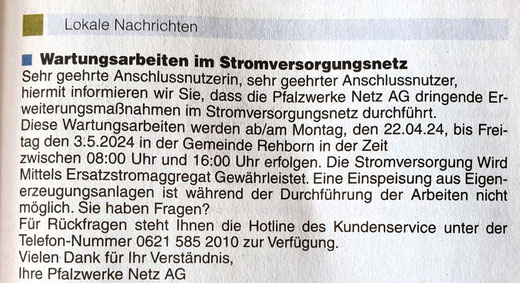 Das Foto zeigt den Stromgenerator, der Rehborn in den vergangenen Tagen mit elektrischer Energie versorgt hat. Das führte dazu, dass PV-Anlagen automatisch abgeschaltet wurden, also für Stunden keinen Strom erzeugten, der dann vom Anlagenbesitzer gekauft werden musste. Ob die Arbeiten am Stromnetz abgeschlossen sind, ist mir nicht bekannt – heute gab es jedenfalls keine Abschaltung.