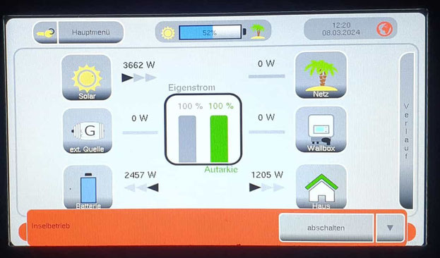 Es gibt ein Problem mit dem Display des E3/DC-Hauskraftwerk: Es bleibt bei Berührung dunkel! Das bedeutet, dass ich nichts einstellen kann. Nach Rücksprache mit einem SonnenPlan-Mitarbeiter, meiner Solarteursfirma aus Zweibrücken, habe ich das Gerät ausgeschaltet und einen Neustart vorgenommen. Das Display war kurz da – dann aber wieder weg. Der Solarteur setzt sich mit E3/DC in Verbindung.