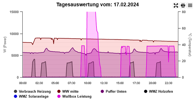 Die Wärmepumpe lief am Mittwoch bei Temperaturen zwischen 2,9 und bis zu 10,7 Grad Celsius insgesamt achtmal an für 365 Minuten. Aus 23,1 Kilowattstunden Strom wurden 71 kWh Wärme und 17 kWh Warmwasser – COP: 3,81.