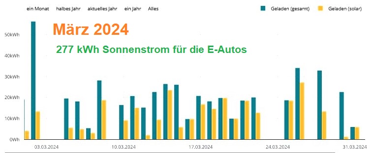 Die beiden E-Autos wurden mit 18,90 (Zoe: 12,13; Kona: 6,77) Kilowattstunden aufgeladen. Das Gewächshaus wurde 6:30 Stunden lang mit 5,916 kWh vor Frost bewahrt. Die Klimaanlage kühlte (!) erstmals in diesem Jahr den Wintergarten mit 1,656 kWh. Die Geschirrspülmaschine war zweimal im Einsatz mit 848 und 890 Wattstunden. Das Aquarium verlangte 807 Wattstunden.