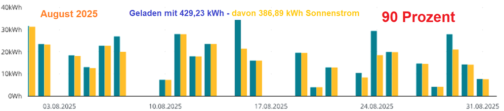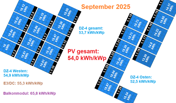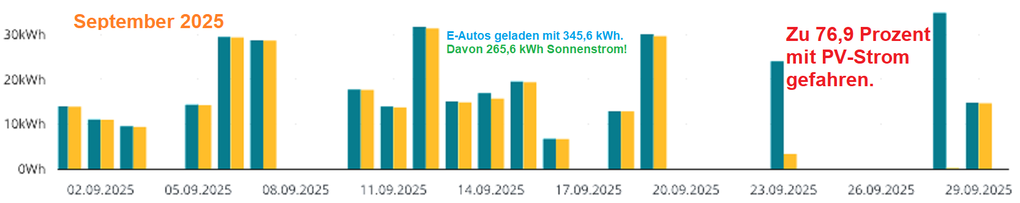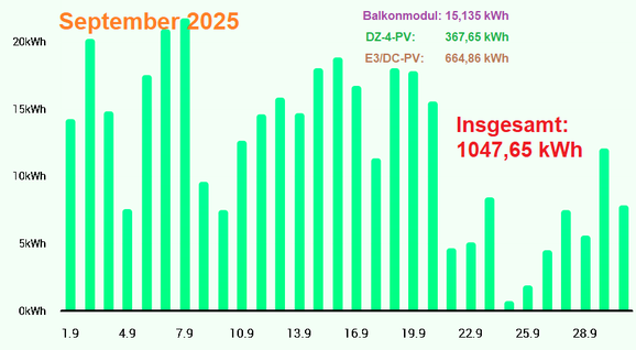 Zur Monatsmitte der übliche Vergleich mit dem September des Vorjahres bezogen auf die gemietete DZ-4-PV. Diesmal ist die Produktion nahezu gleich mit jetzt 106,29 Kilowattstunden zu im vorigen September 108,21 kWh. Das sind 1,8 Prozent weniger Ertrag. Aufs Jahr gesehen zeigt sich 2025 bis heute wesentlich besser. Hier stehen wir jetzt bei 4850 kWh zu im Vorjahreszeitraum ab 1. Januar nur 4376 kWh. Das sind fast 11 Prozent mehr!
