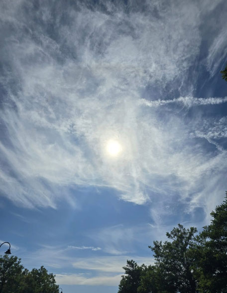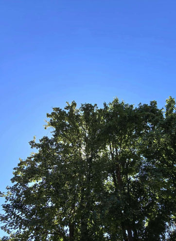Das Foto zeigt einen der noch voll belaubten Bäume - mit der Sonne dahinter - auf der davon verschatteten östlichen Hausseite. Momentan bekommen die PV-Module auf dem Dach gegen 10:30 Uhr nur vereinzelt etwas „wanderndes“ Sonnenlicht bzw. Schatten. Die volle Leistung der Module erst um 11:30 Uhr. Bessern wird sich das erst, wenn in einigen Wochen das Lauf fällt und nur die dann kahlen Äste noch Schatten werfen.