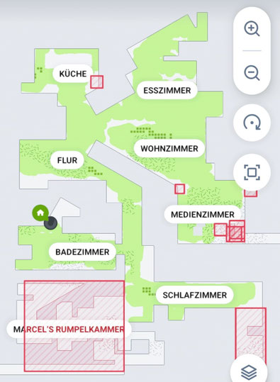 Seit nunmehr sechs Jahren fährt von Montag bis Samstag ein Saugroboter „iRobot 7“ mit eigener Absaugstation im großen Badezimmer durchs Haus. Dafür ist das Gerät vormittags runde 2 Stunden, wobei zwischendrin etwas die Akkus nachgefüllt werden, auf rund 70 Quadratmetern Fliesen und Teppichen sehr gründlich unterwegs. Bestimmt Bereiche sind von den Fahrten ausgeschlossen, weil er sich festfahren könnte: rot markiert. Jetzt habe ich mal den Stromverbrauch auf 24 Stunden gemessen – und war verblüfft! Kehrt der „Robot“ an seine Absaugstation zurück, verbraucht diese für vielleicht fünf Sekunden 1150 Watt. Fürs Nachladen zwischendrin gönnt sich der Akku (vor 3 Monaten erneuert) 30 Watt. Insgesamt aber, für die 24 Stunden, schlägt der Stromverbrauch mit nur 99 Wattstunden zu Buche.