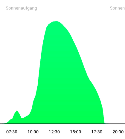 Die E3/DC lieferte Energie von 6:45 bis 20:30 (DZ-4: 6:45 – 20:15) Uhr mit der Spitze um 13:30 (13:15) Uhr von 10.111 (3860) Watt. Erzeugt wurden 57,99 (Anteil: 21,42) Kilowattstunden. 15,47 kWh füllten die morgens restlichen 16 Prozent in den Akkus bis 16:00 Uhr wieder auf. Zugekauft wurde kein Strom; dafür 14 kWh verkauft. Das ostbeste PV-Modul schickte 985 zu 898 Wattstunden vom westbesten Paneel.