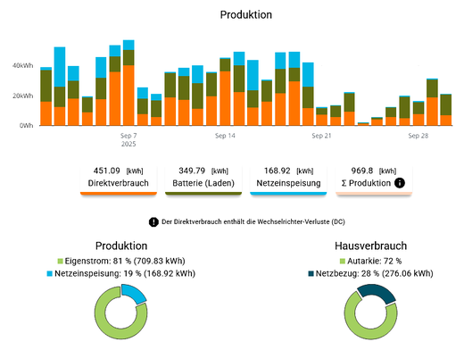 Autarkie 100 % - Eigenstrom 31 % - Netzbezug (ab/bis 0 Uhr): 0,10 kWh.