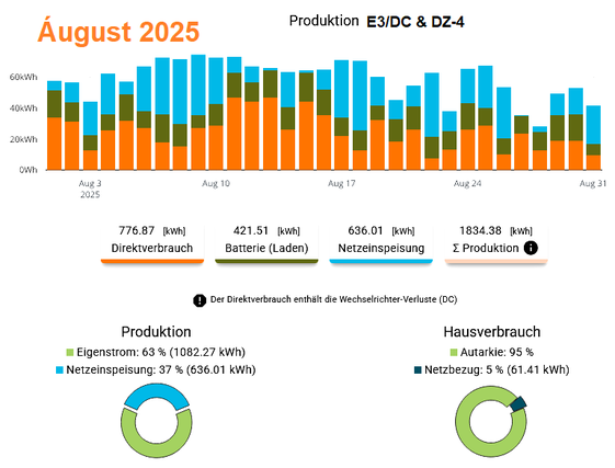 Autarkie 95 % - Eigenstrom 99 % - Netzbezug (ab/bis 0 Uhr): 1,19 kWh.