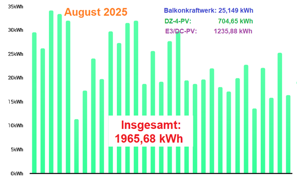 (25.08.2025) Unerwartet der bisher beste Tag des Monats fürs Balkonmodul mit einem weiteren Ein-Kilowatt-Tag. Arbeitsbeginn bei einem von wenigen Zirren geschmückten, blauen Himmel. Im Lauf des Vormittags verschwanden die Zirren, kamen aber zur Mittagzeit als dünne Schleierwolken wieder, um zum frühen Nachmittag hin wieder zu verschwinden. Die beste Modulleistung um 14:07 Uhr. Es wurde die insgesamt 1794. Kilowattstunde ins Hausnetz gedrückt. Der Dienstag soll mit einem blauen Himmel beginnen, den ab der Mittagszeit erste und dann mehr Wolken schmücken. Gegen Abend könnte es Regen geben, der einen Wetterwechsel zu Schwüle und Gewitter in der Nacht zu Mittwoch ankündigt.