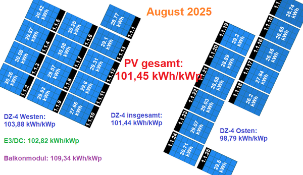 Die E3/DC lieferte Energie von 6:45 bis 20:30 (DZ-4: 6:45 – 20:00) Uhr mit der Spitze um 14:30 (13:00) Uhr von 10.237 (3800) Watt. Erzeugt wurden 71,71 (Anteil: 25,97) Kilowattstunden. Die morgens restlichen 39 Prozent in den Akkus wurden bis 15:15 Uhr wieder aufgefüllt. Zugekauft wurde nichts, verkauft 27 kWh. Das beste östliche PV-Modul lieferte 1,14 zu 1,11 kWh vom Westbesten.